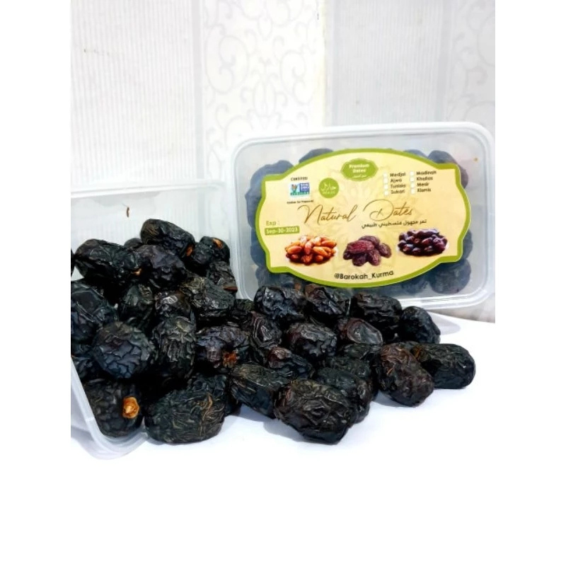 Kurma Ajwa adalah salah satu jenis kurma paling terkenal dan istimewa yang berasal dari Madinah, Arab Saudi. Kurma ini sering disebut sebagai “kurma nabi” karena diyakini merupakan jenis kurma yang paling disukai oleh Nabi Muhammad dengan warna Hitam pekat, kadang keunguan memiliki ukuran Sedang, agak bulat dan tidak terlalu besar serta tekstur Lembut namun sedikit berserat, tidak terlalu lengket kurma Ajwa memiliki rasa Manis lembut dengan sedikit rasa karamel dan madu, serta aroma khas yang tidak terlalu tajam.