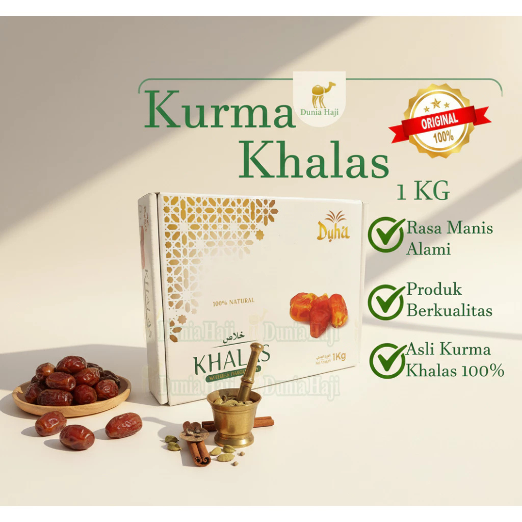 Kurma Khalas adalah salah satu varietas kurma populer asal Arab Saudi, terutama dari daerah Al-Ahsa dan Qassim. Kurma ini terkenal dengan rasa manis lembut yang seimbang, tidak terlalu manis seperti Medjool dan tidak terlalu kering seperti Sukari, menjadikannya favorit banyak orang di Timur Tengah. memiliki warna Cokelat keemasan hingga cokelat kemerahan, ukuran Sedang (2,5 – 3 cm per butir), tekstur Lembut dan sedikit lengket di luar, kenyal di dalam dam rasa Manis lembut dengan sedikit rasa karamel dan madu.