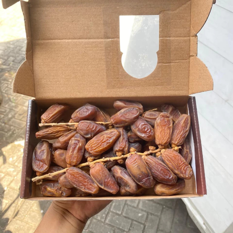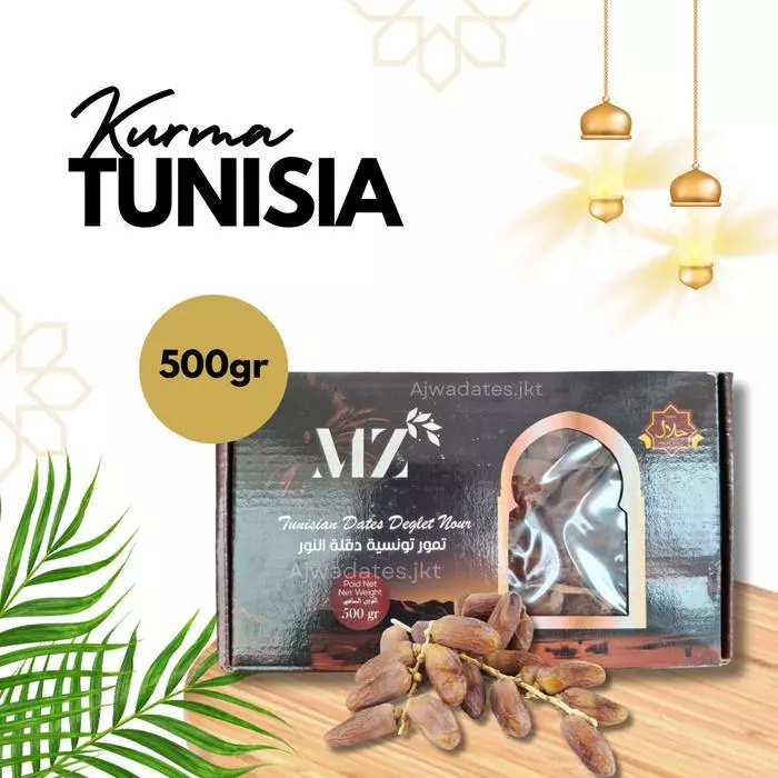 Kurma Tunisia (sering dikenal sebagai Deglet Nour) adalah varietas kurma unggulan asal Tunisia yang terkenal di seluruh dunia karena teksturnya yang lembut dan rasa manis ringan yang elegan. Kurma ini sering disebut sebagai “Kurma Cahaya” karena daging buahnya yang berwarna cokelat keemasan tembus cahaya saat disinari. memiliki ukuran Sedang hingga besar (3–4 cm per butir) rasa Manis ringan, lembut, dengan aroma khas karamel dan madu.