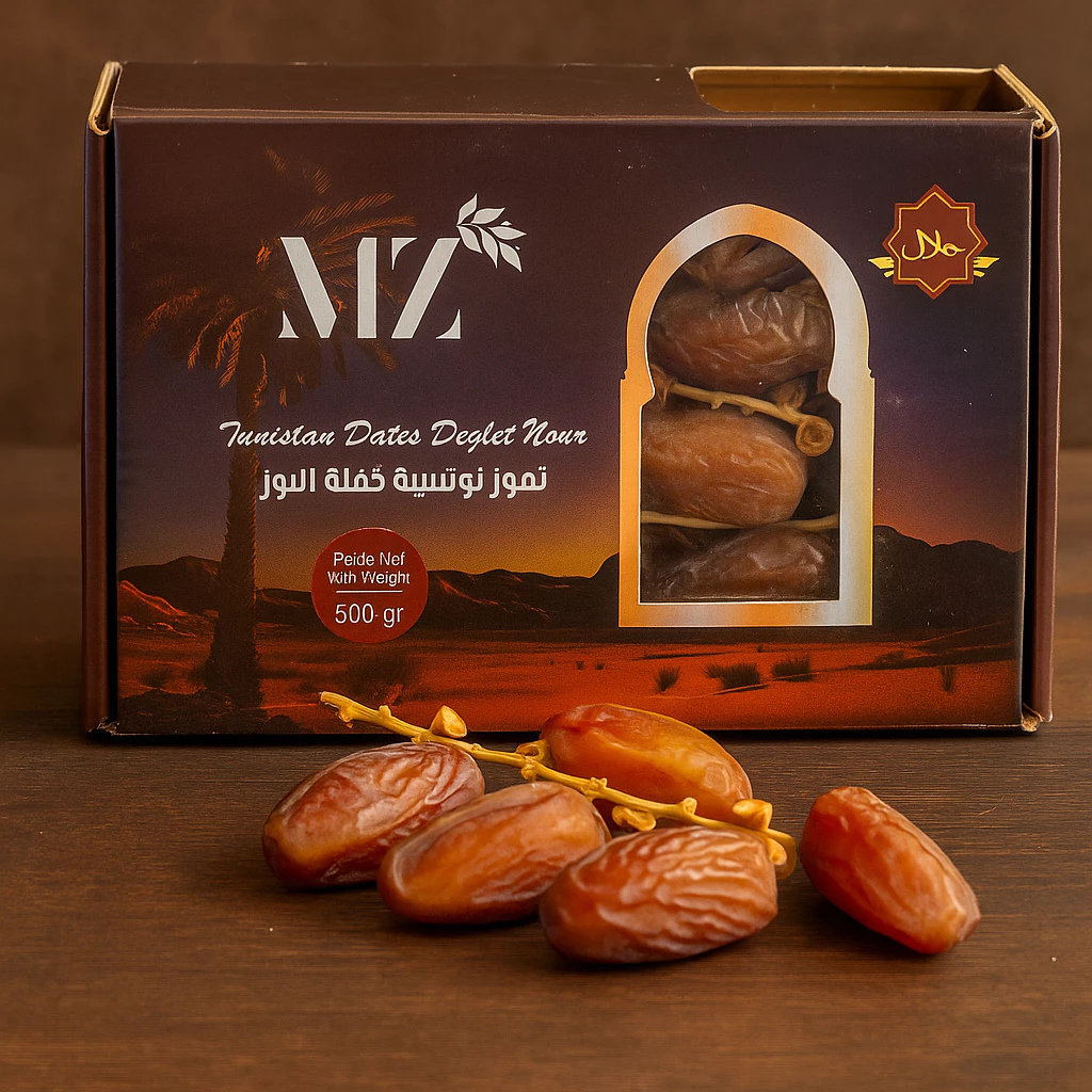 Kurma Tunisia (sering dikenal sebagai Deglet Nour) adalah varietas kurma unggulan asal Tunisia yang terkenal di seluruh dunia karena teksturnya yang lembut dan rasa manis ringan yang elegan. Kurma ini sering disebut sebagai “Kurma Cahaya” karena daging buahnya yang berwarna cokelat keemasan tembus cahaya saat disinari. memiliki ukuran Sedang hingga besar (3–4 cm per butir) rasa Manis ringan, lembut, dengan aroma khas karamel dan madu.